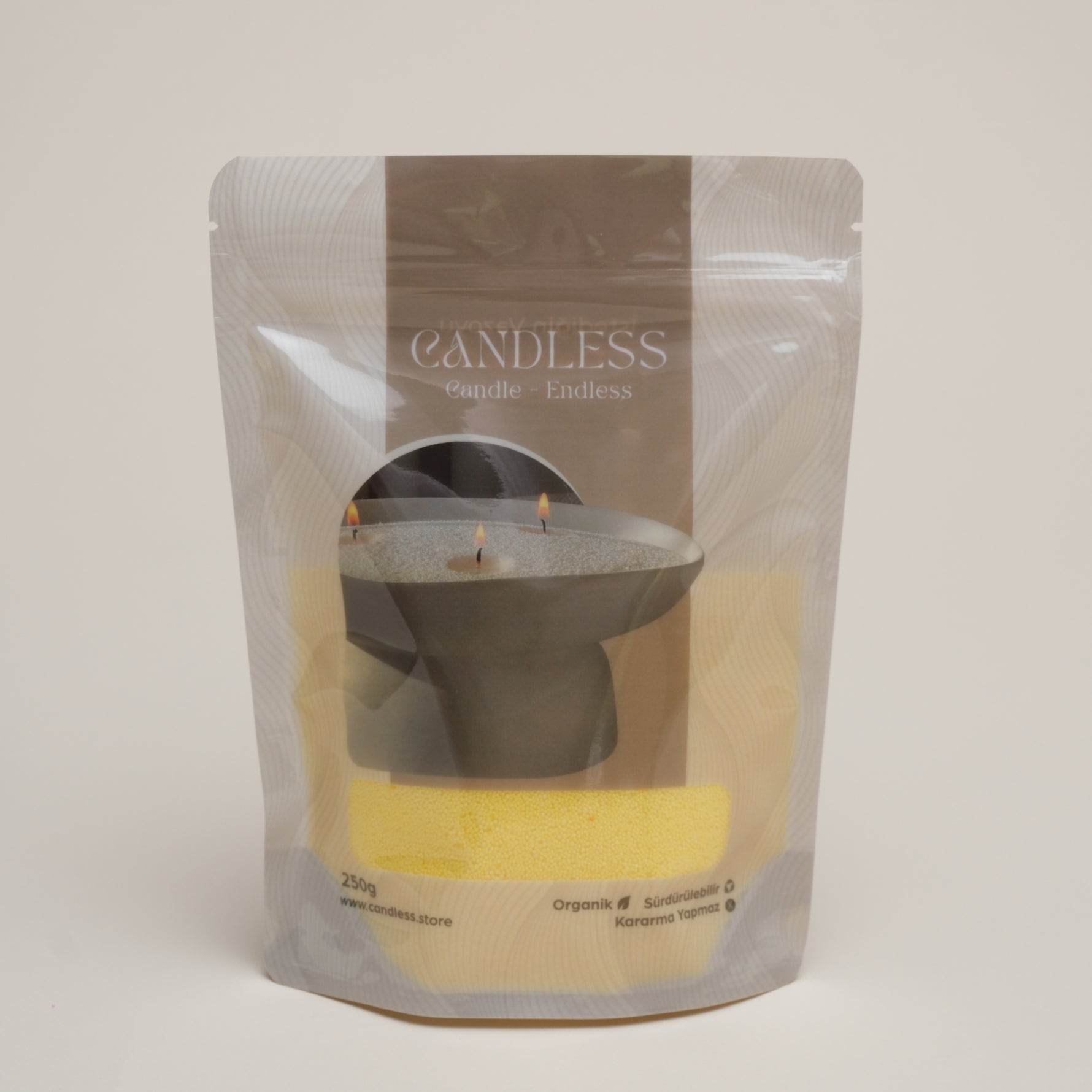 Candless Mumun yanan kısımlarını tekrar kullandığınızda ortalama bir etkinlikte veya evinizde sadece 1000g Candless Mumdan sadece 20g kullanmış olursunuz.